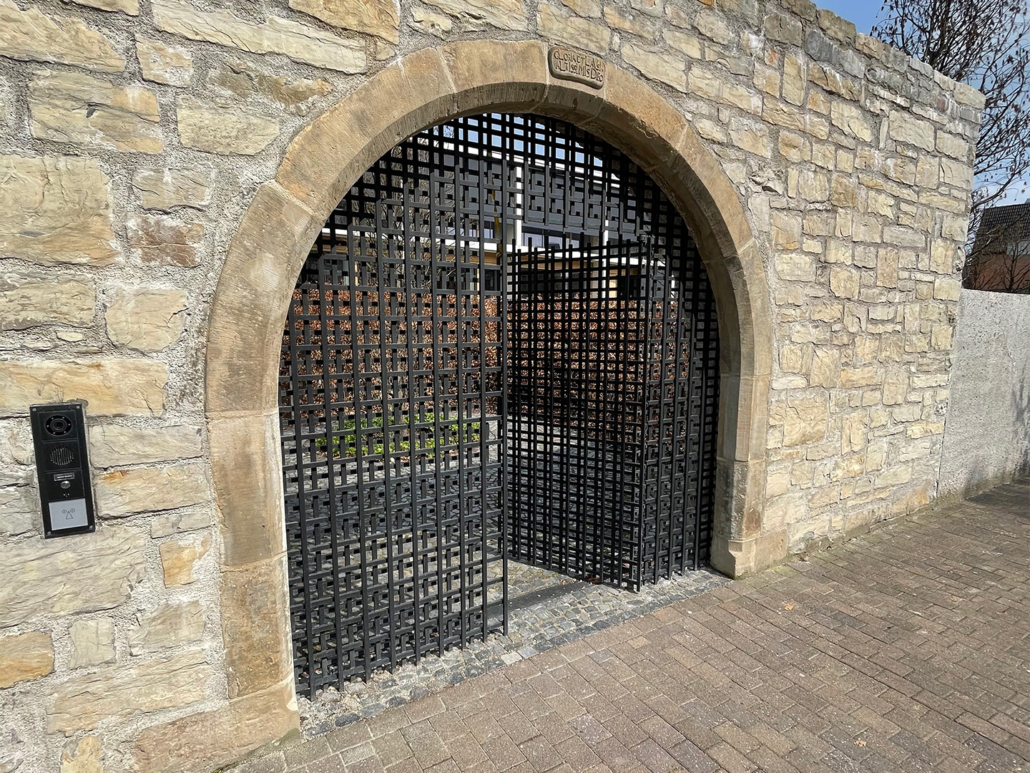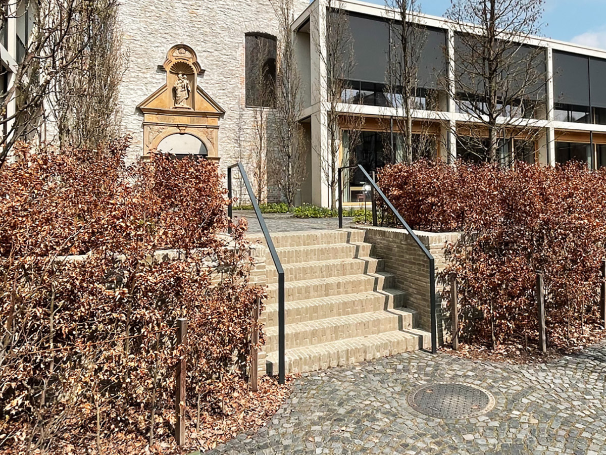 Flachstahlgeländer mit Füllung aus Schweissgitter, Eingangsanlage, Windfang, Diverse Geländer, Pulverbeschichtet